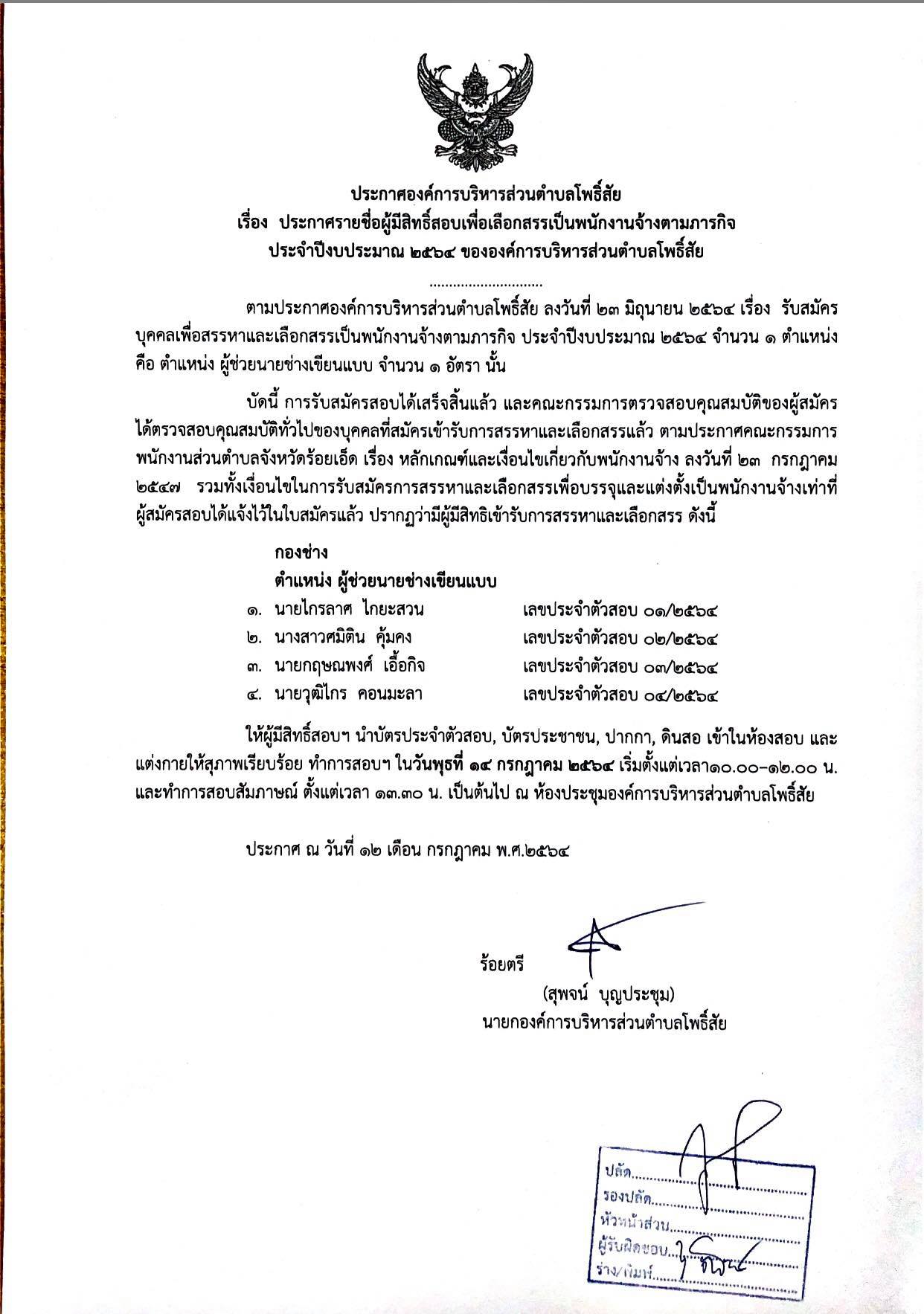 งานส่วนตำบลจังหวัดร้อยเอ็ด เรื่อง หลักเกณฑ์และเงื่อนไขเกี่ยวกับพนักงานจ้าง ลงวันที่ 23 กรกฎาคม 2547 จึงขอประกาศรายชื่อผู้มีสิทธิ์สอบเพื่อเลือกสรรเป็นพนักงานจ้างประจำปีงบประมาณ 2564 รายละเอียดดังแนบ