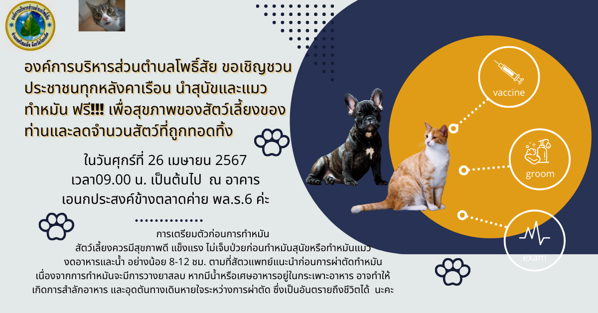 ชื่อเรื่อง : ขอประชาสัมพันธ์การทำหมันสุนัข-แมวฟรี ในวันศุกร์ที่26 เมษายน 2567เวลา09.00 น. เป็นต้นไป ณ อาคารเอนกประสงค์ข้างตลาดค่าย พล.ร.6 ค่ะ