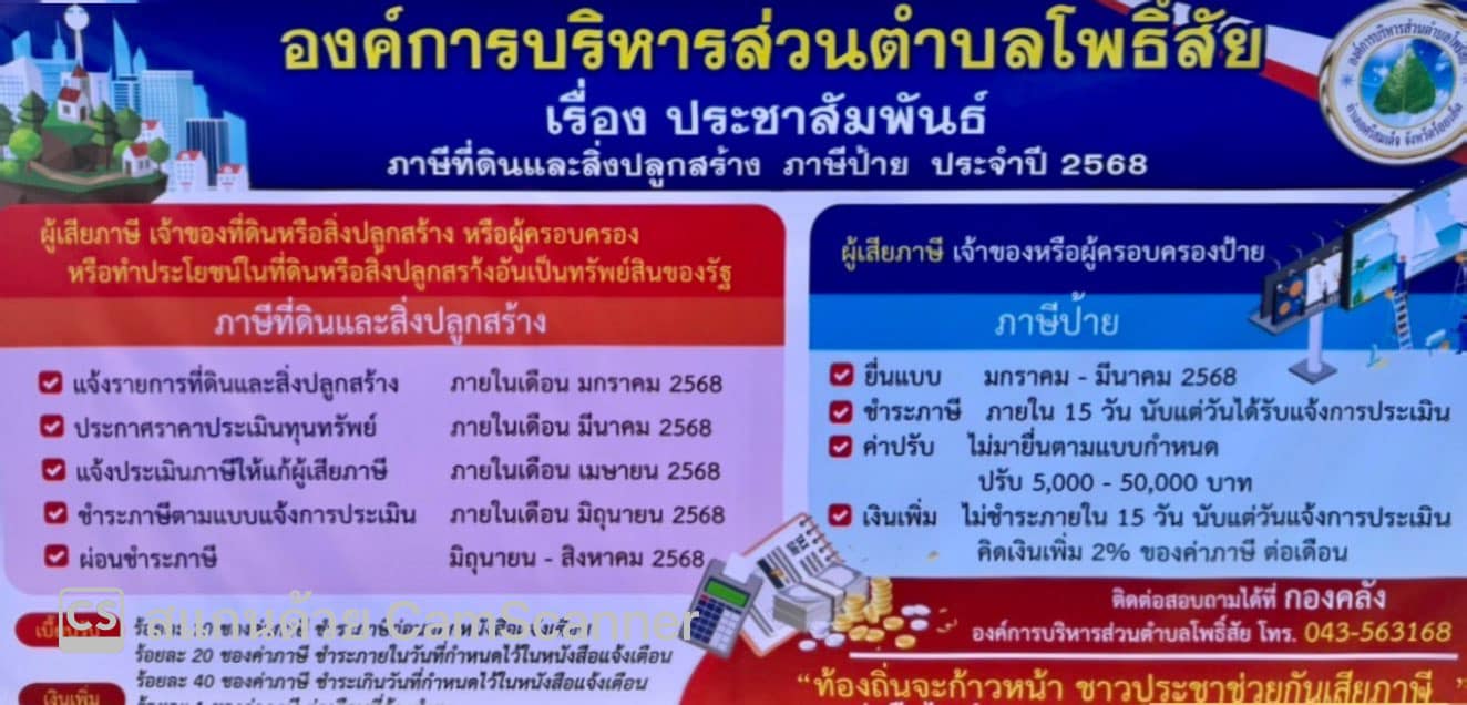 1. อบต.โพธิ์สัย จะส่งหนังสือแจ้งประเมินภาษีที่ดินและสิ่งปลูกสร้าง (ภ.ด.ส.6) ให้ท่านทราบ ภายในเดือนเมษายน 2568