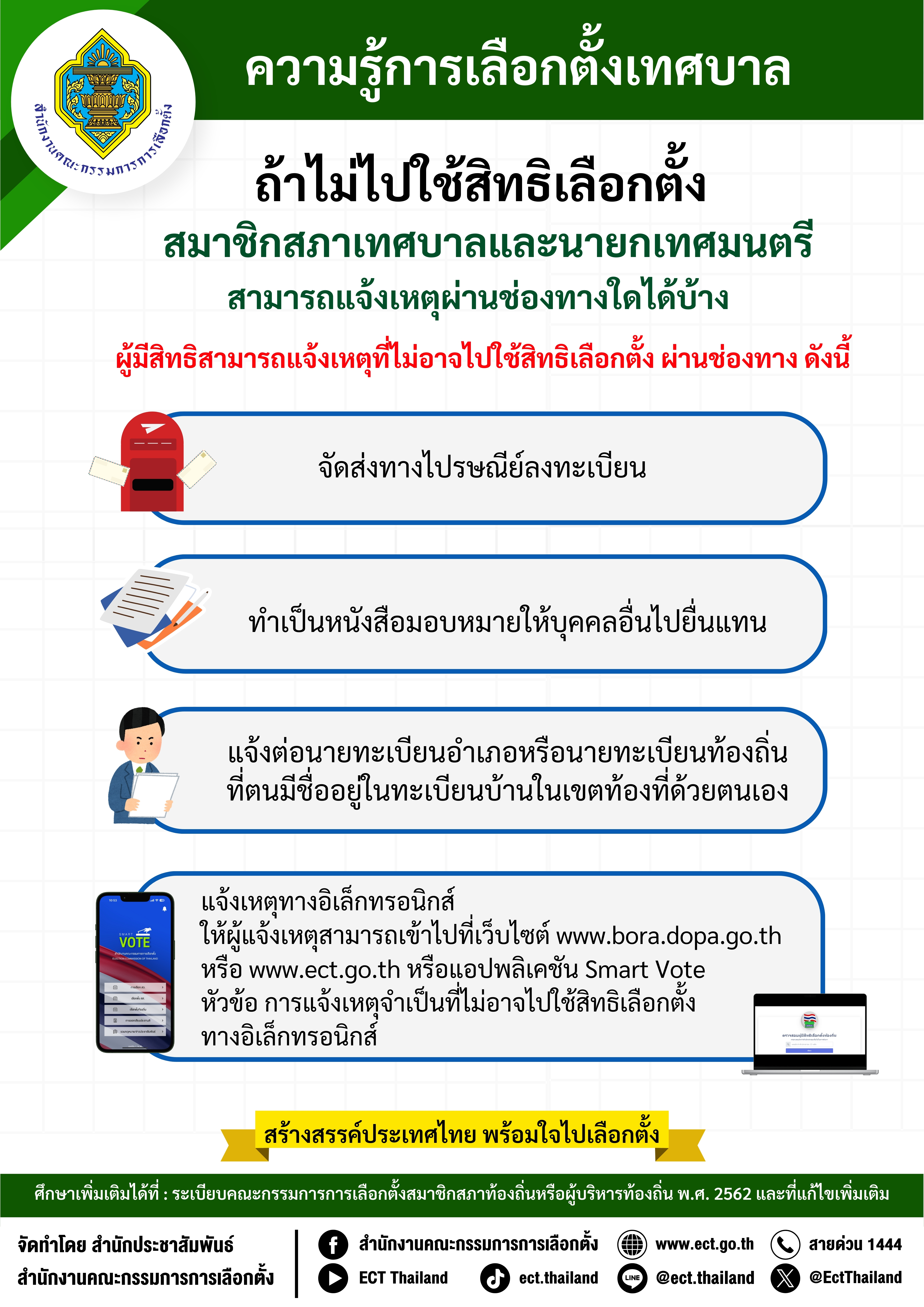 ผู้มีสิทธิเลือกตั้งใดที่ไม่อาจไปใช้สิทธิเลือกตั้งได้ เนื่องจากมีเหตุอันสมควร ให้แจ้งเหตุที่ไม่อาจไปใช้สิทธิเลือกตั้งต่อนายทะเบียนอำเภอ หรือนายทะเบียนท้องถิ่นที่ตนมีชื่ออยู่ในทะเบียนบ้าน โดยทำเป็นหนังสือซึ่งต้องระบุเลขประจำตัวประชาชน และที่อยู่ตามหลักฐานทะเบียนบ้าน ภายใน 7 วันก่อนวันเลือกตั้ง หรือภายใน 7 วัน นับแต่วันเลือกตั้ง ทำหนังสือยื่นต่อนายทะเบียนอำเภอหรือนายทะเบียนท้องถิ่น สามารถแจ้งด้วยตัวเอง หรือมอบหมายให้ผู้อื่นไปยื่นแทน จัดส่งทางไปรษณีย์ลงทะเบียน หรือทางออนไลน์ ผ่านทางแอปพลิเคชัน Smart Vote หรือเว็บไซต์สำนักบริหารการทะเบียน https://boraservices.bora.dopa.go.th/election/abscauselocal/